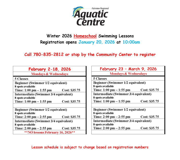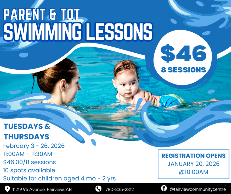 Dive in and unwind at the full-featured Fairview Regional Aquatic Centre. Race along the five-lane lap pool, splash in the wading pool, scream down the tallest waterslide in the Peace Country, and relax in the wheelchair-accessible hot tub. Drop in during designated swim hours, or join one of our aquatic programs, available for any age or swimming level. You’ll be having so much fun, you’ll forget you’re exercising! Keep reading for more information on schedules, rates, lessons, programs and more!