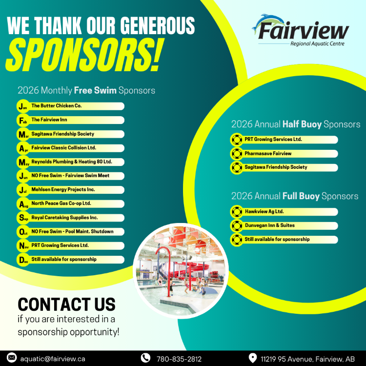 Dive in and unwind at the full-featured Fairview Regional Aquatic Centre. Race along the five-lane lap pool, splash in the wading pool, scream down the tallest waterslide in the Peace Country, and relax in the wheelchair-accessible hot tub. Drop in during designated swim hours, or join one of our aquatic programs, available for any age or swimming level. You’ll be having so much fun, you’ll forget you’re exercising! Keep reading for more information on schedules, rates, lessons, programs and more!