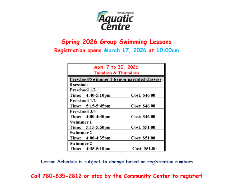 Uniting leisure, wellness, and culture, the Fairview Community Centre is where community thrives and memories come to life. Located on the Northwestern Polytechnic Fairview campus at 11219 95 Ave, the community centre is home to the Fairview Regional Aquatic Centre, the Theatre, and the Fitness Centre. Join us in experiencing a holistic haven where every visit is an opportunity to thrive, grow, and connect. Get more information by calling the community centre reception desk at (780) 835-2812 or subscribe to their Facebook page for daily updates.