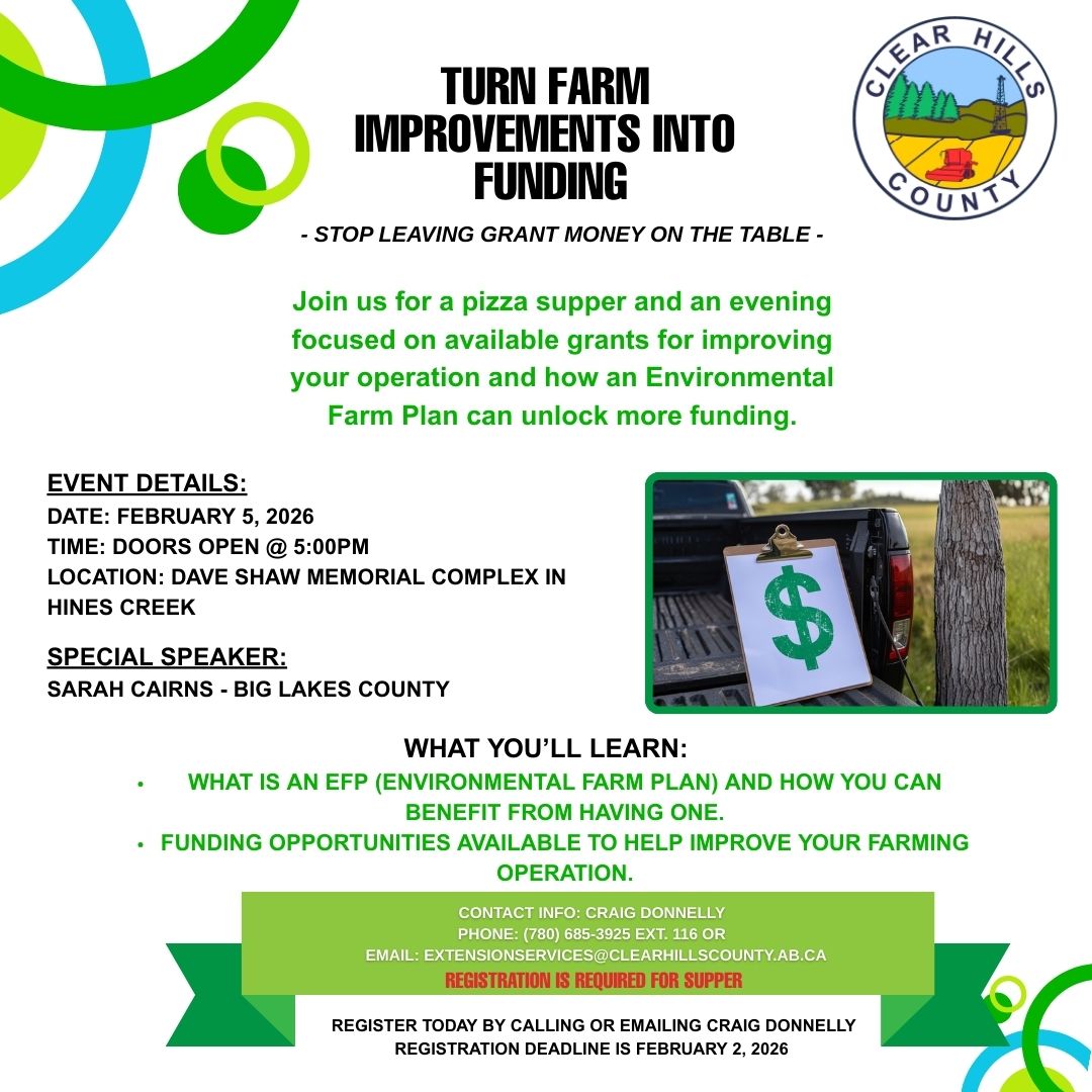 Thinking about improving your farming operation? Join us for a pizza supper and an informative evening focused on available grants and how an Environmental Farm Plan (EFP) can help unlock additional funding opportunities.