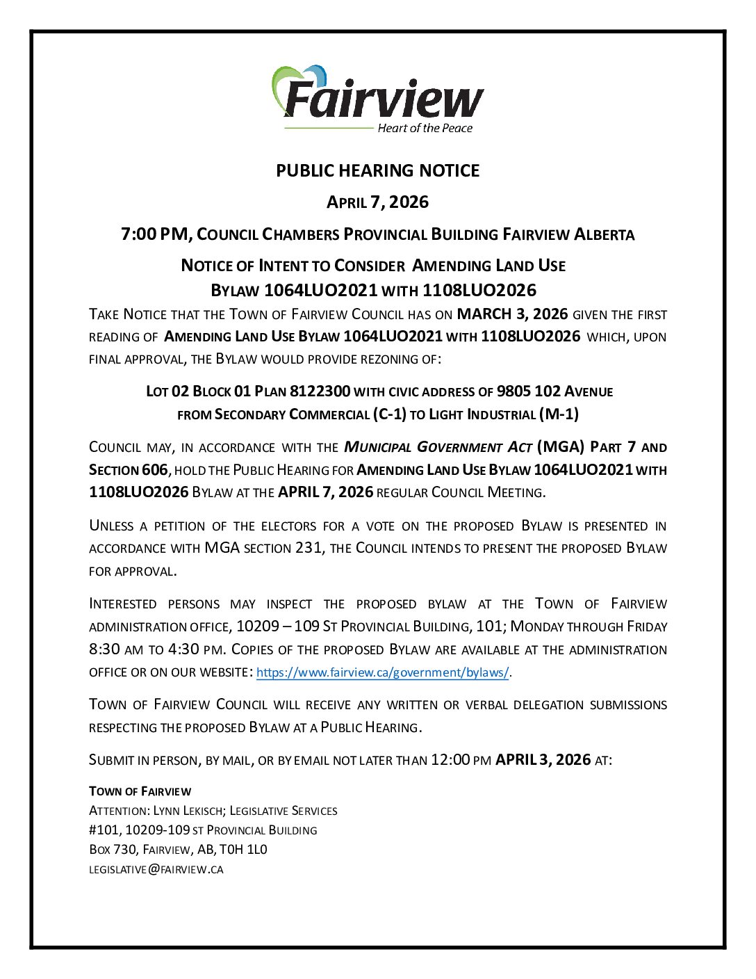 Please note that only one submission will be accepted per person, either written or verbal, and that any information provided, including letters, emails, or in person appearances, become part of the public record and may be published in a Council agenda package which is posted on the Town website for public viewing.