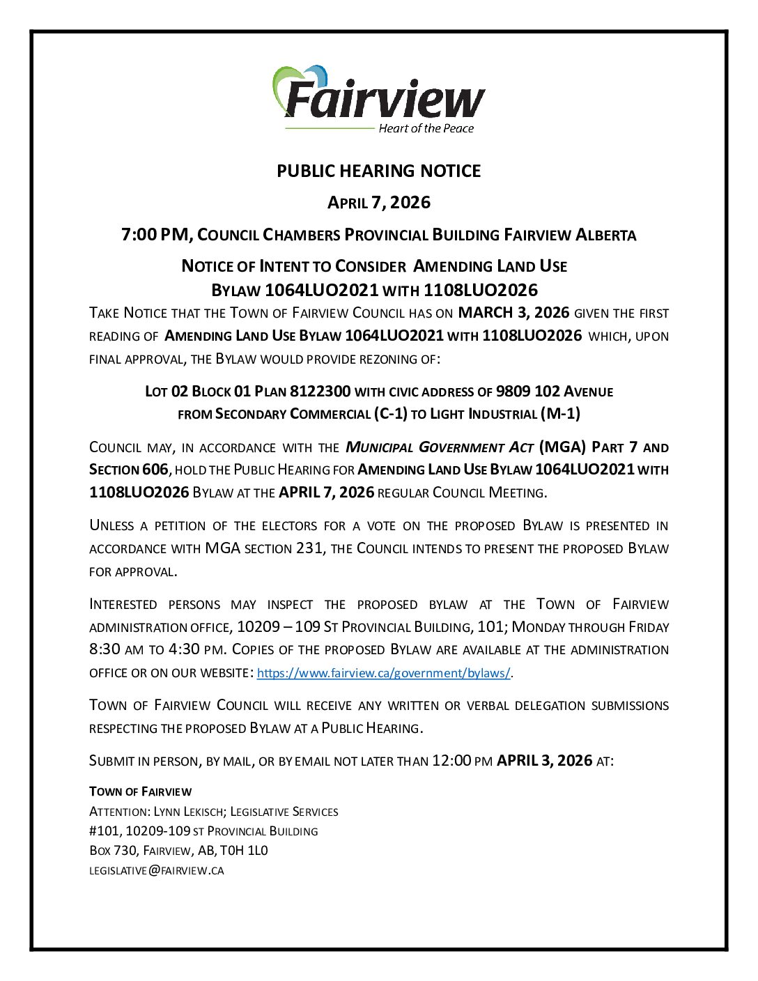 Please note that only one submission will be accepted per person, either written or verbal, and that any information provided, including letters, emails, or in person appearances, become part of the public record and may be published in a Council agenda package which is posted on the Town website for public viewing.